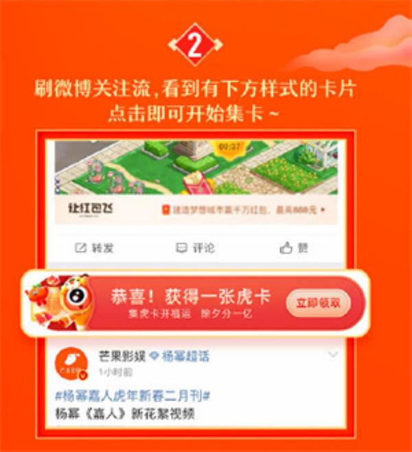 2、刷微博关注,看到有下方样式的卡片点击即可获得虎卡。