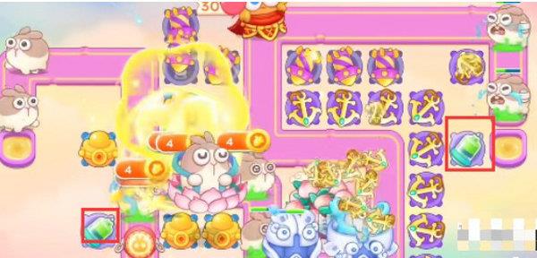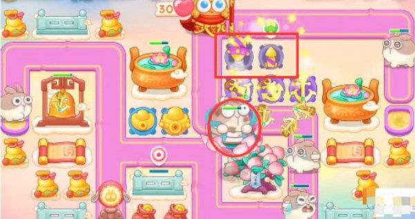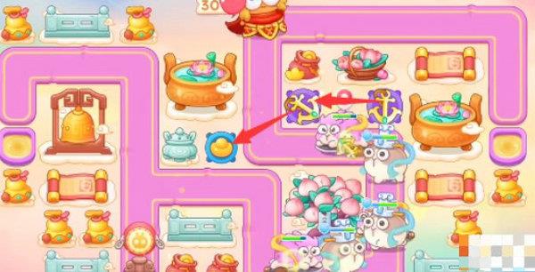 3、在第一轮结束时开始打后方的钱袋,然后在钱袋位置放置两个烟花防御莲花兔。