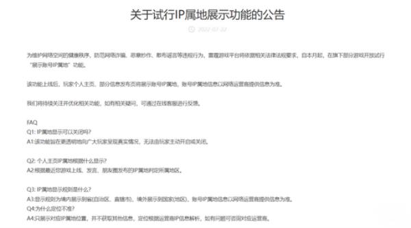该功能上线后,玩家个人主页、部分信息发布页将展示账号 IP 属地,账号 IP 属地信息以网络运营商提供信息为准。
