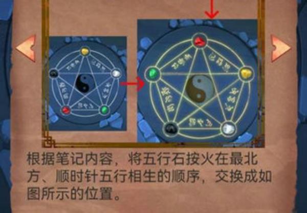 7、根据笔记提示将五行石放入法阵并且调整位置,火在北方,顺时针按照火土金水木的顺序摆放