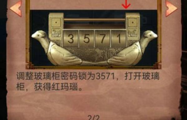 2、查看麻将桌,两个幺鸡之间是三条、五筒、七万、一筒,得到密码【3571】,打开玻璃柜取得【红玛瑙】