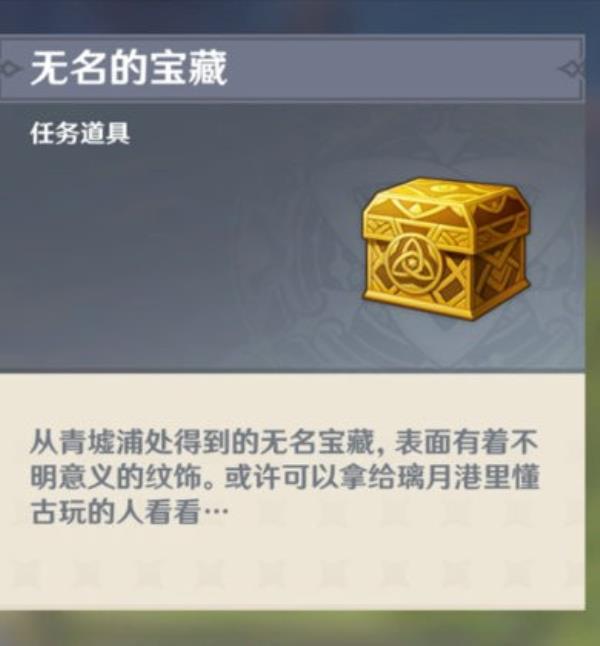 玩家们可以在璃月的遁玉陵、灵矩关与青墟浦搜集到无名的宝藏。宝藏表层拥有未知实际意义的纹样,玩家们可以将其交到璃月港里懂古玩的人看一下。