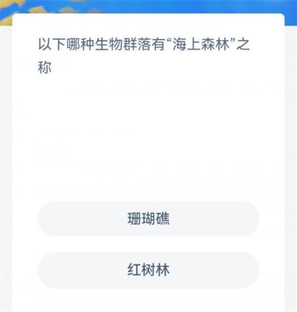 神奇海洋今日答案最新10.11是什么呢?神奇海洋是支付宝中的一个公益活动,每天答题可以获得拼图,就有机会获得许多奖励,今天的题目是:以下哪种生物群落有海上森林之称?相信很多小伙伴还不清楚这个答案是什么,其实这趟并不难,答案是:红树林。