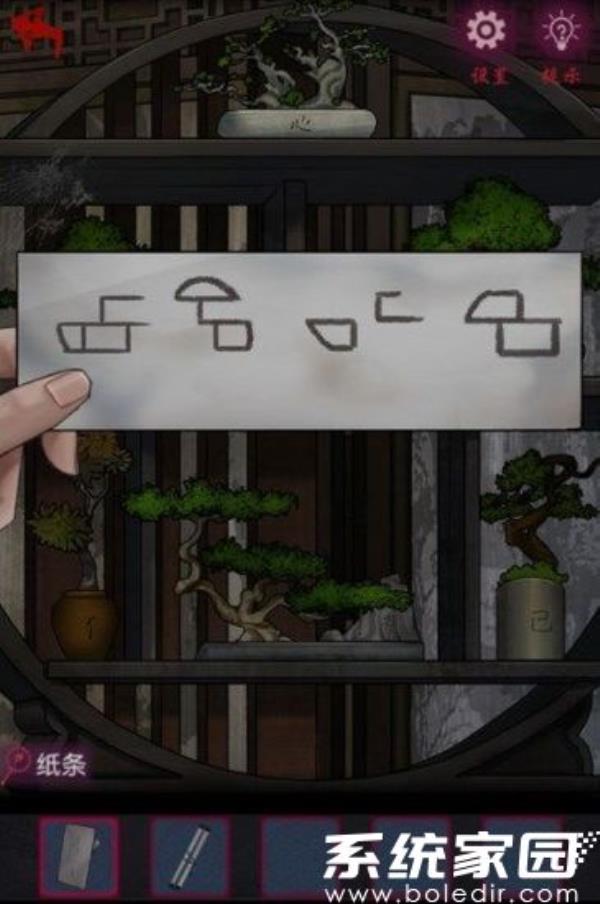 6、 铃铛挂在窗边的绳子上,窗口出现人影,点对应窗口记住后面的纹样,墨水倒在 桌子上的纸条上,出现提示结合窗口的滑块顺序解开地毯下的机关,打开后有一-个纸条和照片,点击进下章