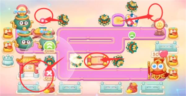 4、把圈内的道具优先清理掉,然后在空出来的格子上都放置多重箭,等到桃子来了再升级。