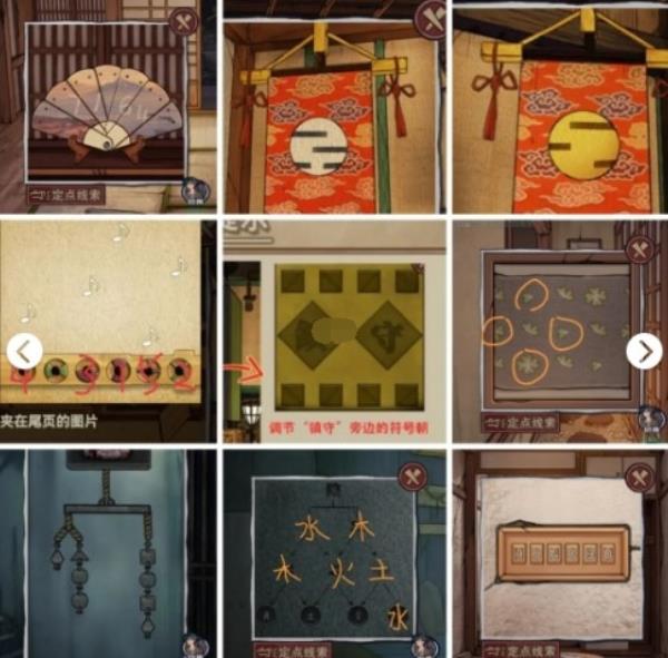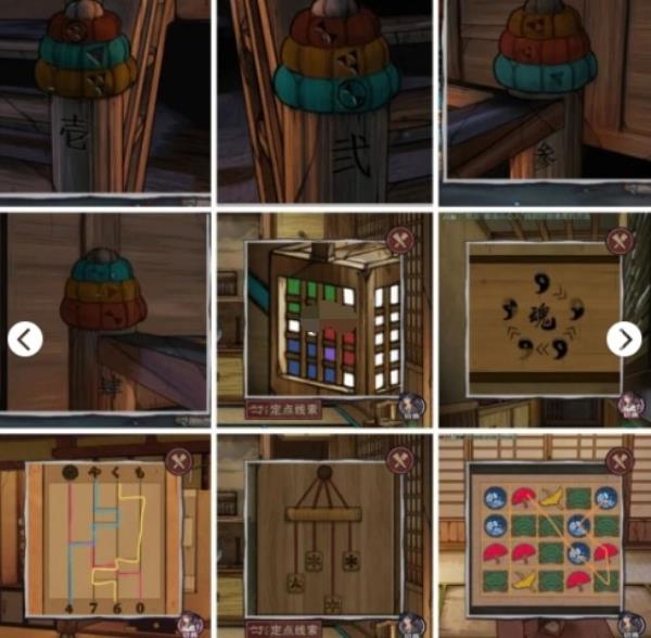 5.打开柜子得到火柴,另一边柜子得到拉链头,对着灯使用火柴,得到提示打开门,梳妆镜得到针线,对着右侧抱枕使用拉链头,得到柜子钥匙,打开柜子将绳子挂在第三个,观察左侧得到密码,打开得到盘子,将盘子放回,对着刺绣使用针线,得到提示结合梳妆镜的提示,得到密码如图,观察和室地板得到盒子密码,打开得到拔钉器,将庭院添水的钉子拔开,观察水池和盘子上的花数量得到密码为4946,观察树上得到提示,打开箱子得到剪刀,对着扇子使用剪刀,排序好得到7164,观察水池颜色对应的数量,得到密码为454,查看过道右下角的布,打开后得到钥匙,根据衣柜和花瓶上(颠倒过来)的提示,得到密码为HONOBU,得到玄武石块,返回最初的场景,柜子得到木偶娃娃,调整好挂饰如图,得到花饰,将木偶娃娃放回凹槽,得到流苏,根据画中提示,制作好头饰,返回人偶头上,打开柜子得到白虎石块。