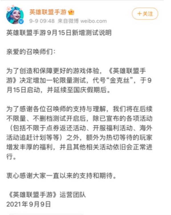 为了创造和保障更好的游戏体验,《英雄联盟手游》决定增加一轮限量测试,代号“金克丝”,于9月15日启动,并延续至国庆假期后。