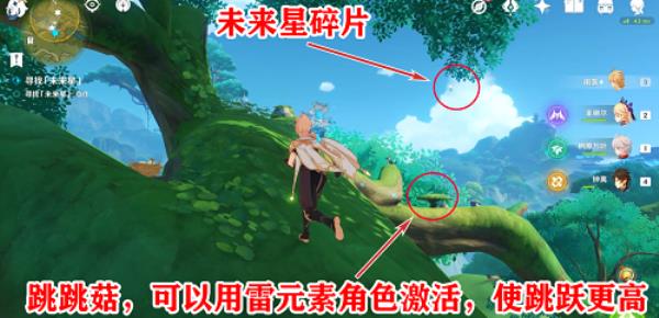 4、上来之后就能看到「未来星」碎片,然后下方有一个跳跳菇,可以用雷元素角色激活一下,能跳跃更高