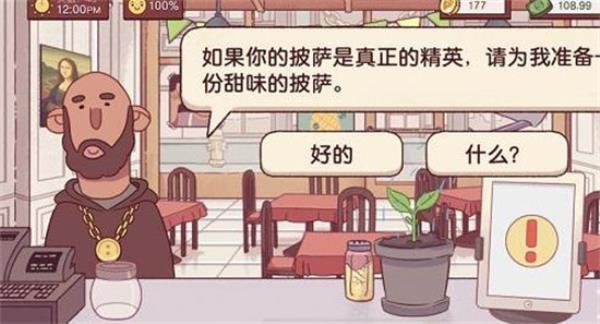 1、在披萨神教其中一个顾客的披萨挑战中,需要为其做一个甜味披萨,很多玩家不知道甜味披萨需要放哪些食材,放了所有水果之后发现也不对,其中的原因是因为青椒也是水果,很多玩家没有想到;