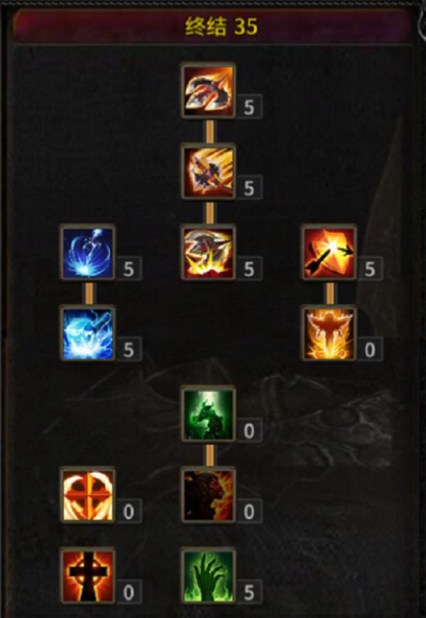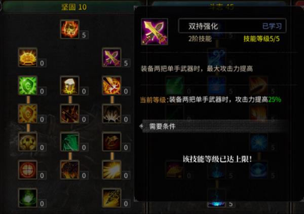 (2)玩力量战士可以先点完中间三个加力量的天赋,可以极大的提升自身的攻击,也可以提供一定的技能百分比的伤害,点完这三个之后,可以按照需求选择自己需要的技能,将“终结”栏点至30级后,点亮技能“暗爆炎强化”,强化持续伤害,让技能的伤害最大化。最后点击“坚固”栏的“双持强化”,大幅提升攻击力。
