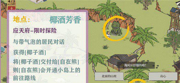 1.与带气泡的居民对话,获得[椰子酒],将[椰子酒交付给[自在熊],则[自在熊]会开通小岛上的前往路线。