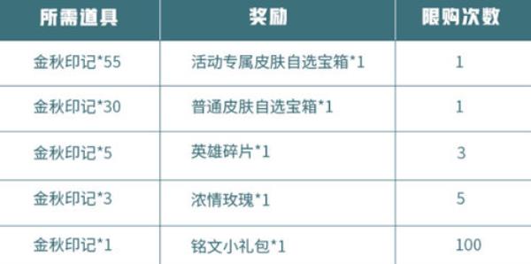 活动期间最多可获得金秋印记*80,消耗55个或30个可分别兑换活动专属皮肤自选宝箱或普通皮肤自选宝箱(活动期间两种宝箱仅可选择一种兑换哦)