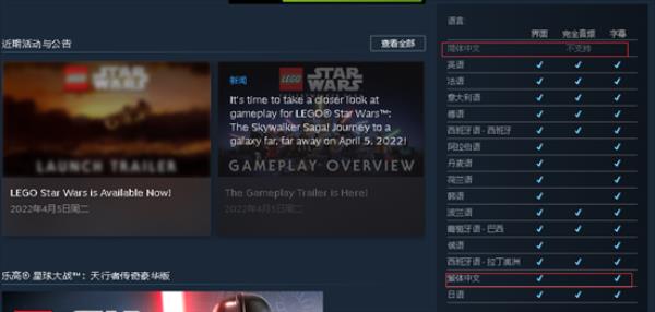 乐高星球大战天行者传奇有中文吗?这是备受欢迎的乐高系列作品,你可以在游戏中飞跃太空,随时随地的前往任何星球体验各种玩法,目前steam平台就有发售,价格为248元,豪华版为298元,很多玩家在问该游戏是否支持中文。