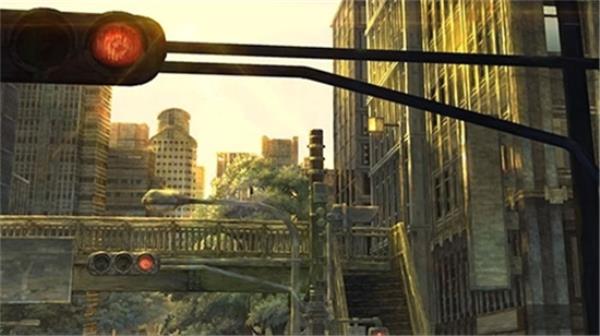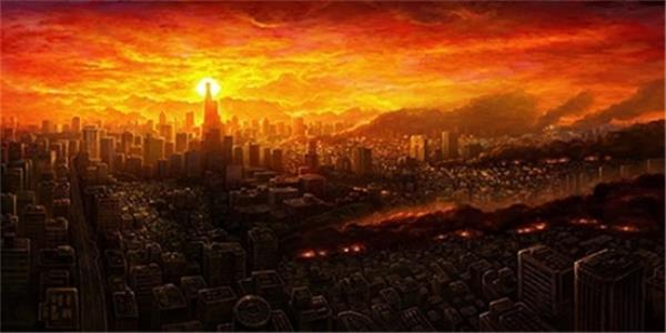 被夕阳染成一片橘红色的街道。里面似乎可以发现有黑烟和火光。这个世界到底发生什么事了呢?