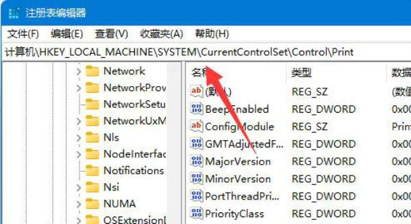 3、然后进入注册表的“计算机\HKEY_LOCAL_MACHINE\SYSTEM\CurrentControlSet\Control\Print”位置。