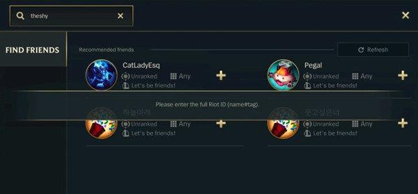在搜寻并添加好友的时候可以看到提示,要求玩家输入的是对方的完整的Riot ID,也就是需要名称加上后面的Tag。