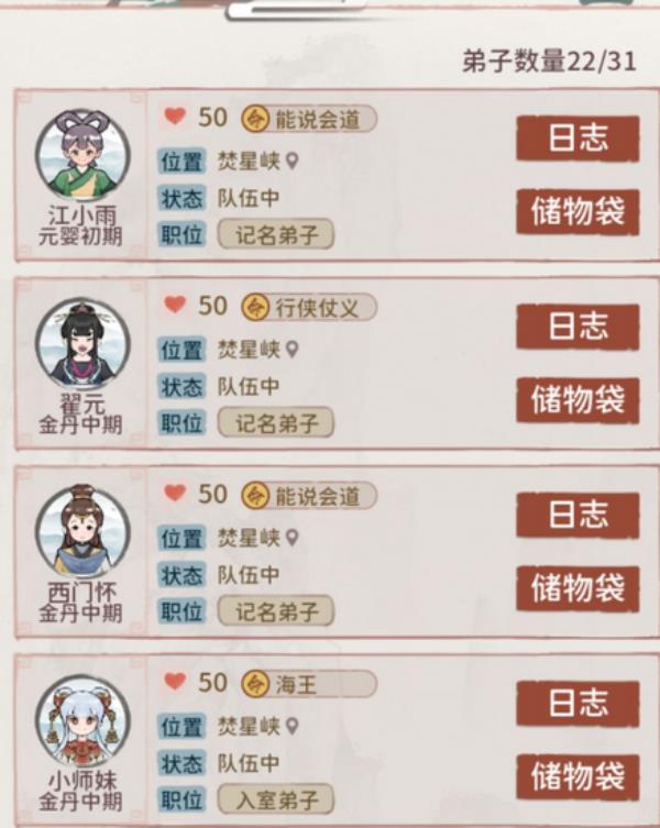 游戏中的弟子也是非常重要的,每个弟子都有不同的特点,合理的利用每位弟子的特点,可以让你更加轻松的完成各项任务。