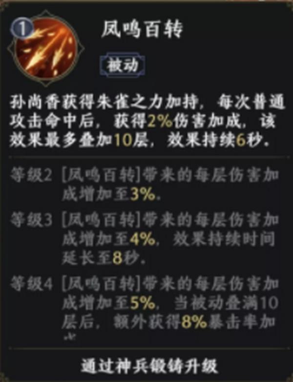 孙尚香获得朱雀之力加持,每次普通攻击命中后,获得2%伤害加成,该效果最多叠加10层,效果持续6秒。这也就意味着孙尚香可以长时间持续进行爆炸输出,并且持续时间6秒,最高可有10层,是孙尚香技能中最核心的技能!