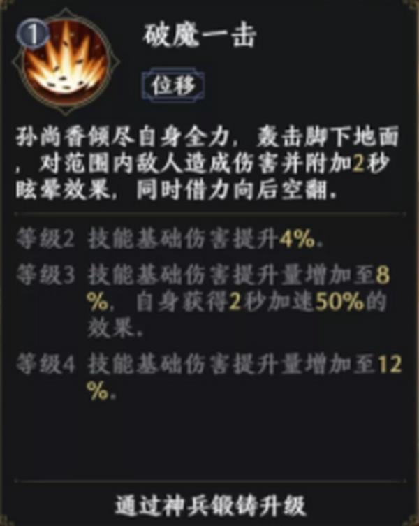孙尚香倾尽自身全力,轰击脚下地面对范围内敌人造成伤害并附加2秒眩晕效果,同时借力向后空翻。这是孙尚香最具有控制的技能,可以眩晕2秒,也是孙尚香保命技能的唯一核心,防止对面前排靠近孙尚香!