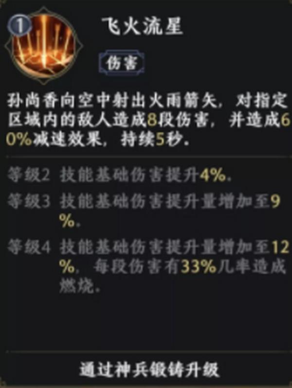 孙尚香向空中射出火雨箭矢,对指定区域内的敌人造成8段伤害,并造成60%减速效果,持续5秒。这是孙尚香的群体aoe伤害的技能,高爆发的同时,具有一定的减速效果,这也意味着孙尚香可以长时间一直对他输出,进行伤害最大化!