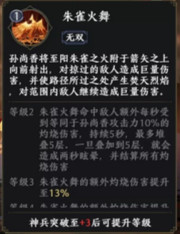 孙尚香将至阳朱雀之火附于箭矢之上向前射出,对掠过的敌人造成巨量伤害,并使路径所过之处产生焚天烈焰,对范围内敌人继续造成巨量伤害。这是孙尚香aoe范围伤害的代表,伤害是所有技能中最高的伤害,而且是两段伤害,第一段是技能本事的伤害,第二段是烈焰灼烧的伤害!是非常恐怖的技能!!