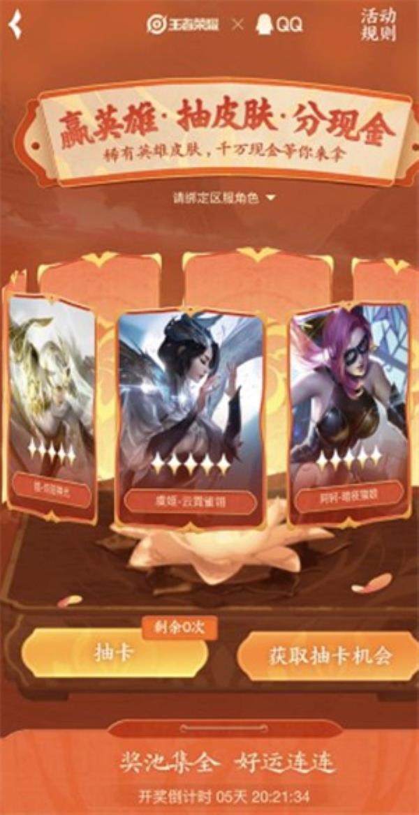 玩家点击进入这个活动中就可以看到有抽卡的按键,这个就是抽永久皮肤的活动,虽然和微信区名字不一样,但是都是一样的福利活动。