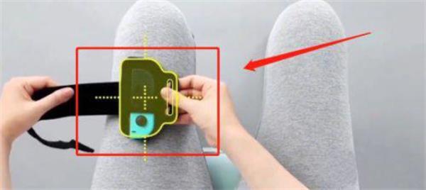 3、坐在椅子上将腿部固定带对准大腿的中心点,不要偏离中心点,用腿带缠绕大腿将腿带拉到右侧把前端黏住固定,腿部固定带穿戴完成。如果腿带太松请重新绑紧。并确认是否穿戴于大腿正中央。