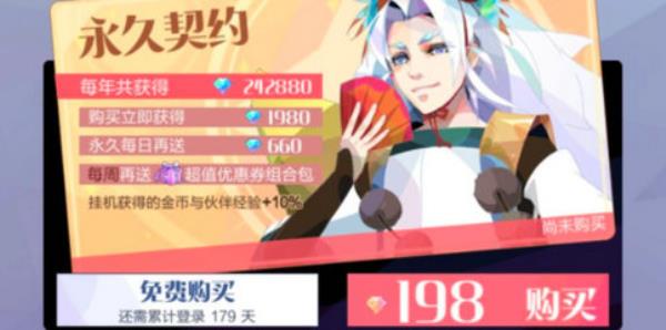 解锁后永久生效,购买后立即获得1980钻石奖励,每天还能额外获得660钻石。(每年共可以获得242880钻)。