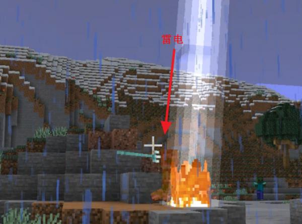 我们在【雷雨天气下】在野外找到【爬行者】,然后右键【按住三叉戟】对准爬行者扔出就可以触发引雷效果了,会从天而降一道闪电击中爬行者。