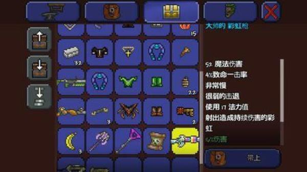 1、七色彩虹枪:仅有在地牢的神圣宝箱得到 ,而宝箱需要用相匹配的钥匙开启。钥匙需要“模具+神庙钥匙(世纪之花坠落)+恐惧之魂5+力量之魂5+视野之魂5”,随后在秘银/山铜(奥钢)钻处生成。丛林,腐化,恐怖,寒霜,神圣模具要在肉山后匹配环境打怪,有0.04%(1/2500)的概率坠落一个模具。射出去一束七色彩虹,不断五秒,遇到七色彩虹即会遭受伤害,指定刷怪神器。唯一的缺陷便是操作并不是很灵活,需要神跑位来填补这一点。