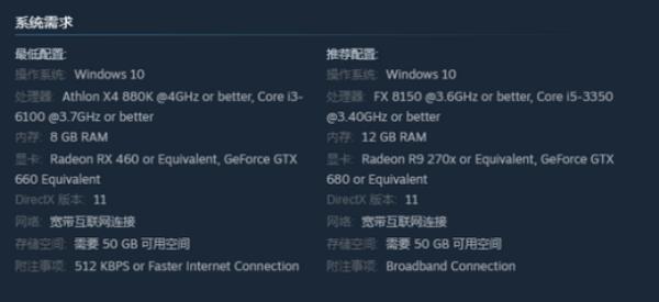 处理器: Athlon X4 880K @4GHz or better, Core i3-6100 @3.7GHz or better