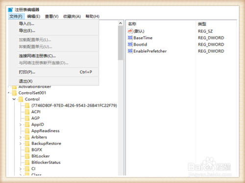 6:进入注册表编辑器后,依次选择HKey_local_machine--system--controlset001--control键值,然后依次找session manager--Memory management--PrefetchParameter目录夹