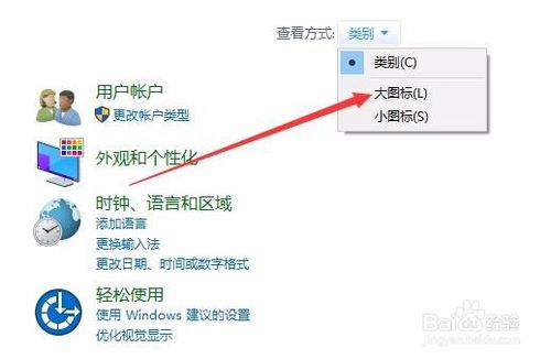 2:在打开的windows7控制面板窗口中,点击右上角的“查看方式”下拉菜单,在弹出菜单中点击“大图标”菜单项。