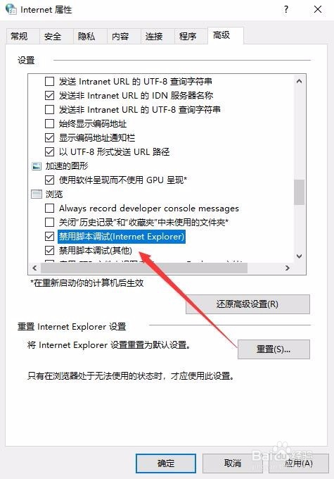 5:在打开的高级设置窗口中,找到“禁用脚本调试(internet Explorer)与“禁用脚本调试(其他)”两项,同时选中前面的两个复选框。