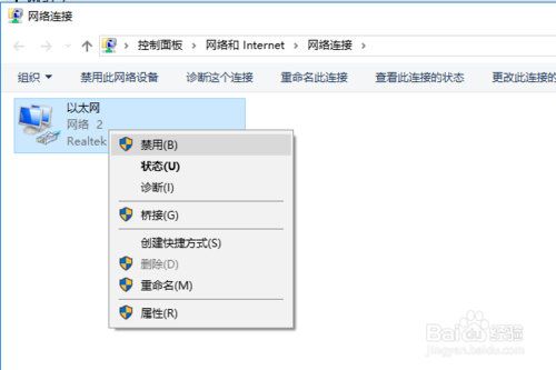 4:第四步,在网络连接界面中,鼠标右键点击连接的网络,然后在弹框中点击禁用,如下图所示: