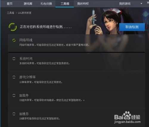 4:进入“LoL游戏修复”界面,LoL运行环境检测完成后,点击“全面修复”,再运行LoL客户端程序。