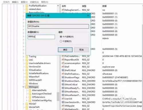 7:最后我们找到“sFCdisable”并双击,输入值为ffffff9d,至于为什么要输入这个值我也不明白,我师父就是这样教我的,同样的我们最后需要重新启动电脑,文件保护就可以被关闭了。