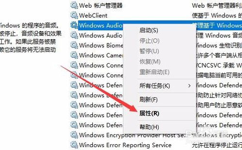 4:右键点击windows Audio服务项,然后在打开的菜单中选择“属性”菜单项