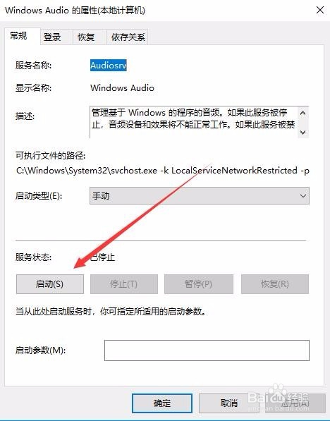 5:在打开的属性窗口中,点击“启动”按钮,启动该服务。