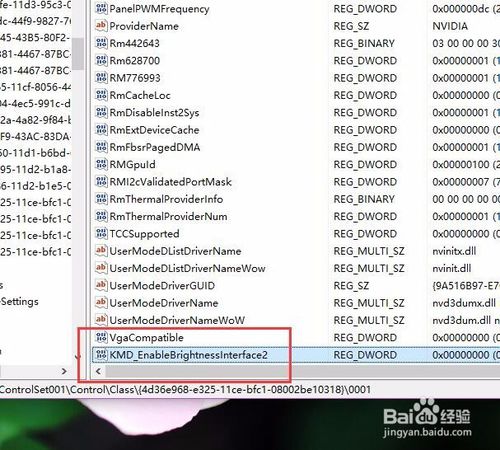 5:接下来,按照同样的步骤,在子项0001目录下击右键,选择“新建-dwoRd(32位)值”选项,并将其命名为“KMd_EnableBrightnessinterface2”,然后双击打开该子项值,将该子项值修改为“0”。