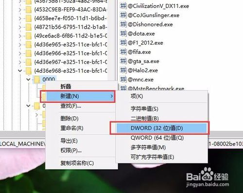 3:接下来,双击打开{4d36e968-e325-11ce-bfc1-08002be10318}子项之后,在该项下找到0000和0001两个子项,然后对着0000子项击右键,选择“新建-dwoRd(32位)值”选项。