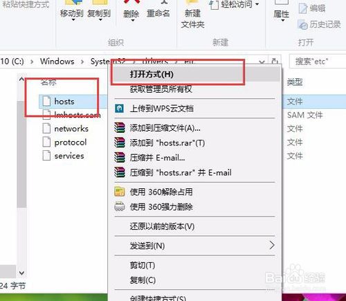 2:打开该文件目录以后,在该文件目录下请大家找到hosts文件,右键点击该文件,在弹出的菜单中选择”打开方式“选项。