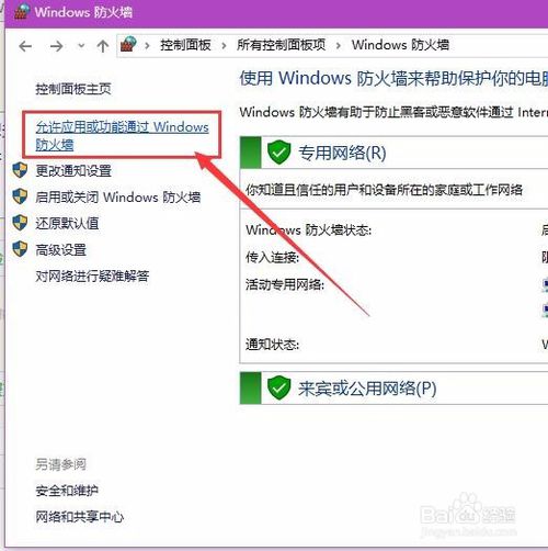4:如果你不想关闭windows系统防火墙软件的话,那么我们还有一个折中的办法,那就是点击页面左侧上方的“允许应用或功能通过windows防火墙”选项。