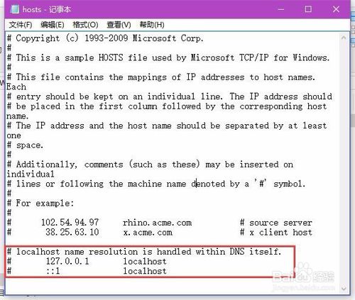 4:使用记事本方式打开该文件之后,请大家仔细检查一下该页面中是否存在被添加了和微软windows更新有关的iP地址,如果有的话,请大家及时删除,正常的Hosts文件设置和下面的示例图是基本一致的。