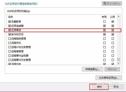 5:在接下来打开的设置页面中,点击选择“windows应用商店”选项,然后将其的网络访问权限全部更改为允许,然后点击确定按钮并保存相关的设置。一般来说,该权限默认是处于开启状态的,如果是因为一些软件错误的系统设置原因,才可能导致发生变化。
