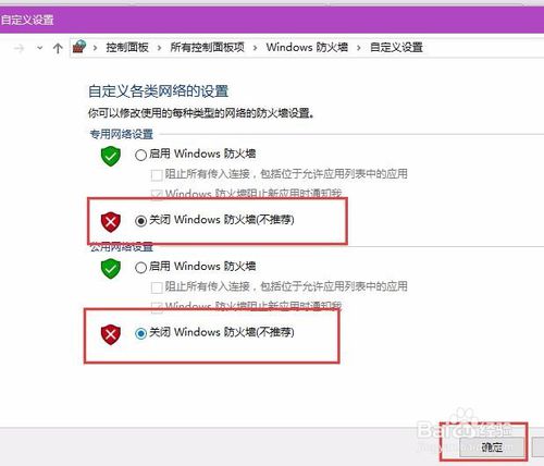 3:接下来,无论是公用或者是专用网络防火墙,建议大家都将其关闭,然后点击页面底端的“确定”按钮,保存对windows防火墙的设置更改。
