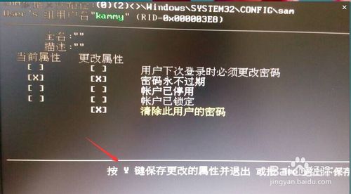 5:查看你要清除密码的用户名。然后把它前面的序号输入到下面的选择输入序号那里。再回车。进入下一个界面后再按一下Y
