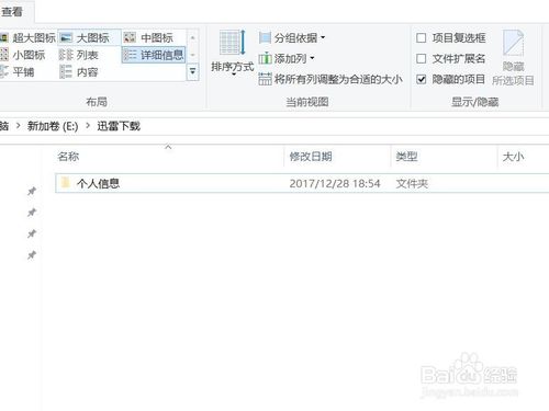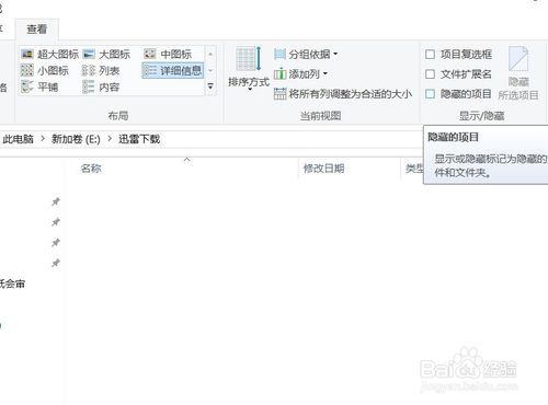 5:若要查看隐藏的文件夹,点击文件资源管理器左上角的查看,在下拉列表中“隐藏的项目"前的小方框打钩,隐藏的文件夹就会显示出来。