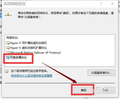8:选择可靠多播协议 ,点击确定按钮,然后重启电脑。如下图所示
