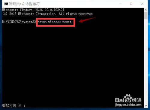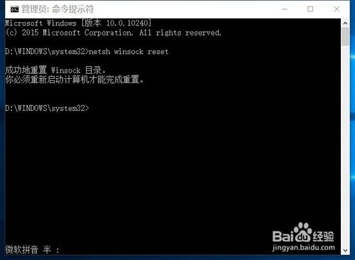 10:在提示框输入netsh winsock reset,回车,如下图所示